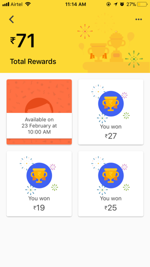 Every time you transfer money using Tez, you receive a scratch card from which you would receive anywhere between ₹10 and ₹1000, which motivates us to keep using the app to transfer money just to see how much money we would get from the scratch cards.