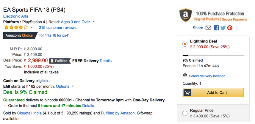 If you notice the “Lightning Deal” section, it says the deal ends in approximately 11 hours. So, if you are a big fan of Fifa and were looking to buy that game, it creates some pressure in your head that if you don’t buy it within the next few hours, you’ll lose that deal forever!